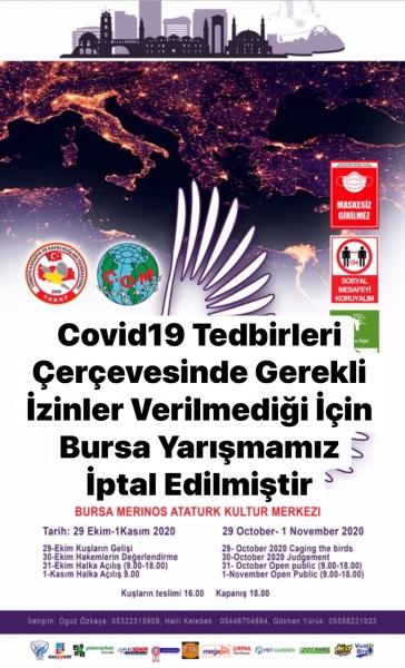 Değerli arkadaşlar Bursa’da 29 Ekim 1 Kasım 2020 tarihinde düzenleyeceğimiz 9. Doğu Akdeniz Ülkeleri Uluslararası Kafes Kuşları Yarışmamız Covid 19 sebebiyle gerekli izinler verilmediği için iptal edilmiştir. Bilginize sunulur.